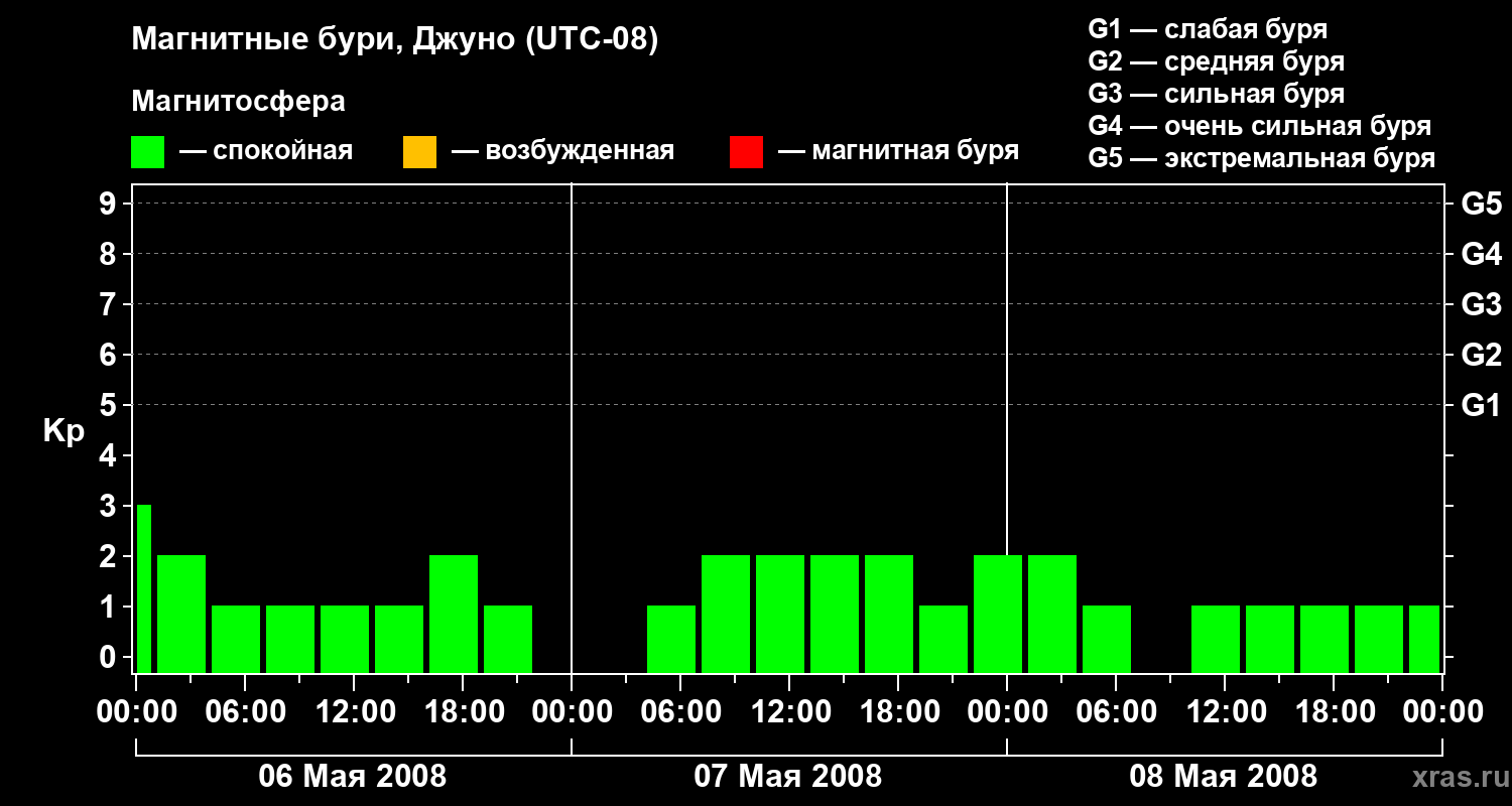 Изменения геомагнитного индекса Kp с 6 по 8 мая 2008 года для средних широт