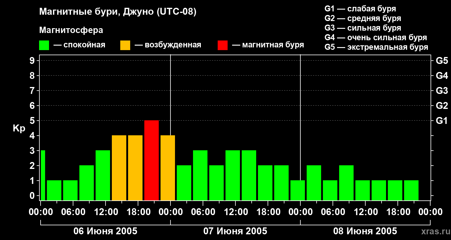 Изменения геомагнитного индекса Kp с 6 по 8 июня 2005 года для средних широт
