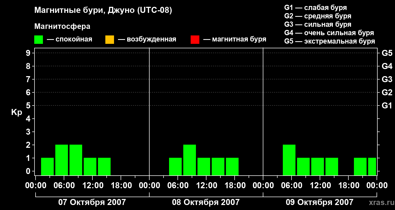 Изменения геомагнитного индекса Kp с 7 по 9 октября 2007 года для средних широт