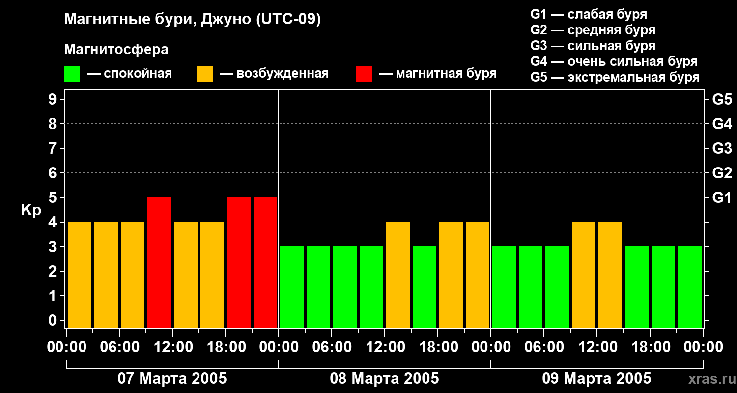 Изменения геомагнитного индекса Kp с 7 по 9 марта 2005 года для средних широт