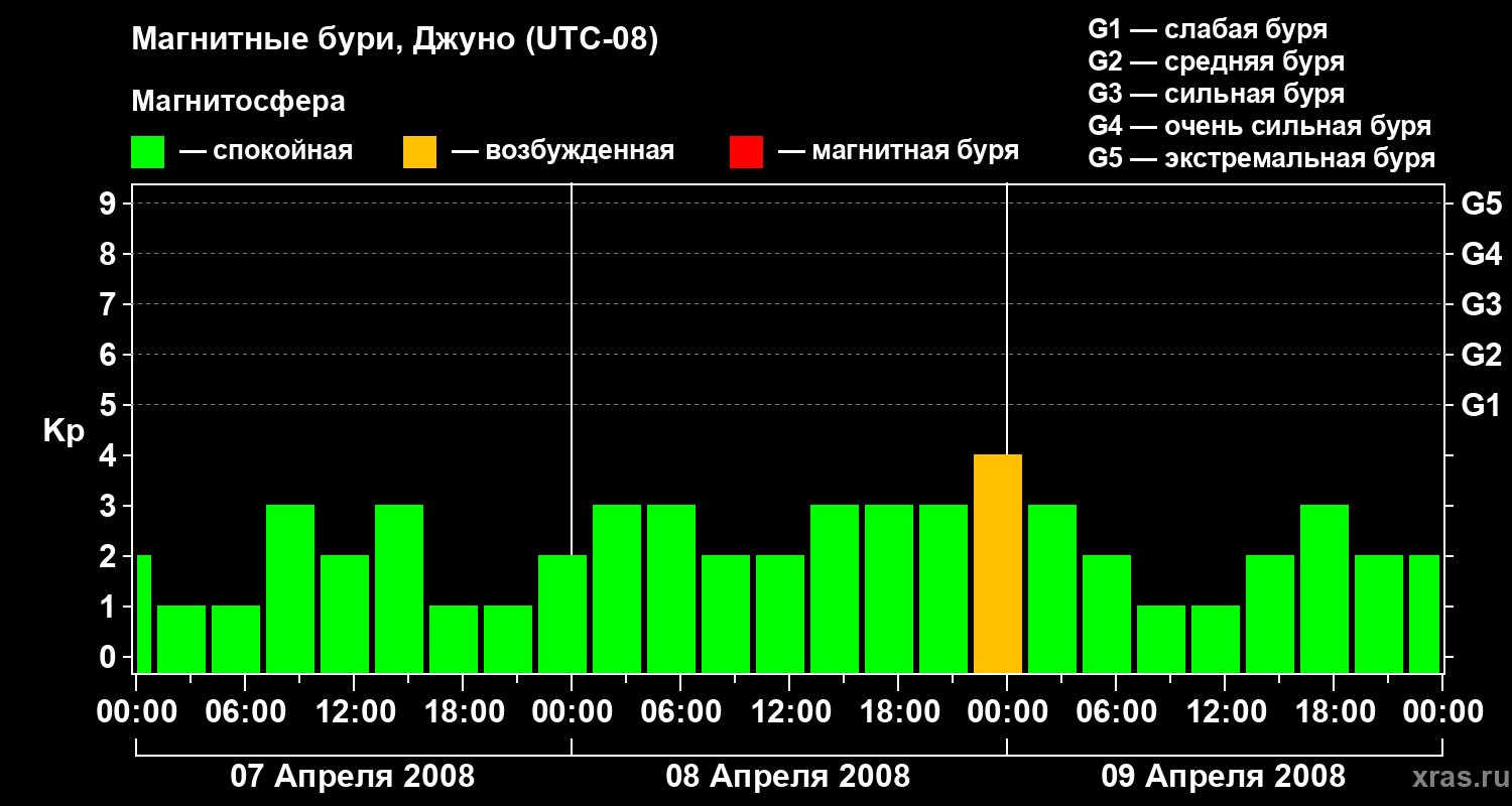 Изменения геомагнитного индекса Kp с 7 по 9 апреля 2008 года для средних широт
