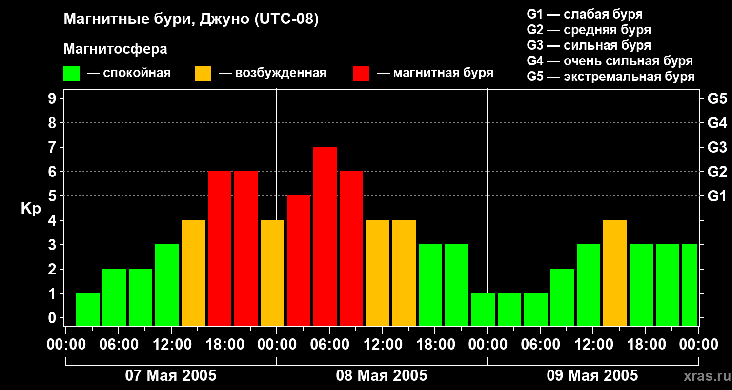 Изменения геомагнитного индекса Kp с 7 по 9 мая 2005 года для средних широт