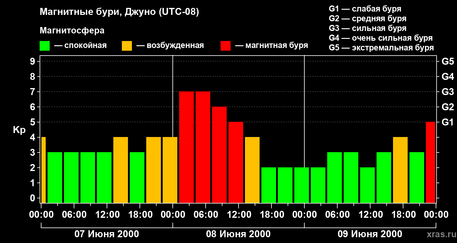 Изменения геомагнитного индекса Kp с 7 по 9 июня 2000 года для средних широт
