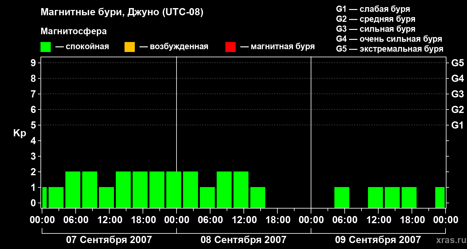 Изменения геомагнитного индекса Kp с 7 по 9 сентября 2007 года для средних широт