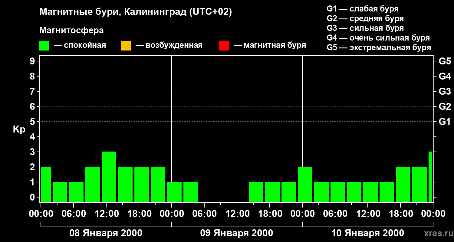 Изменения геомагнитного индекса Kp с 8 по 10 января 2000 года для средних широт