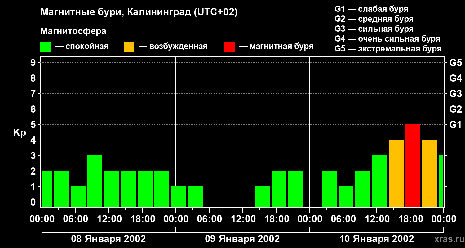 Изменения геомагнитного индекса Kp с 8 по 10 января 2002 года для средних широт