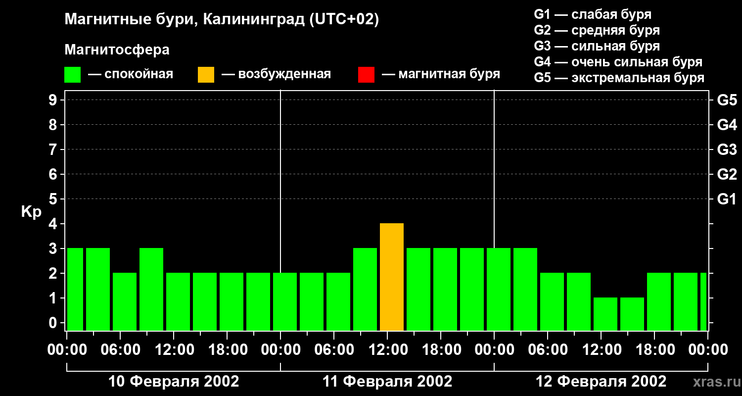 Изменения геомагнитного индекса Kp с 10 по 12 февраля 2002 года для средних широт