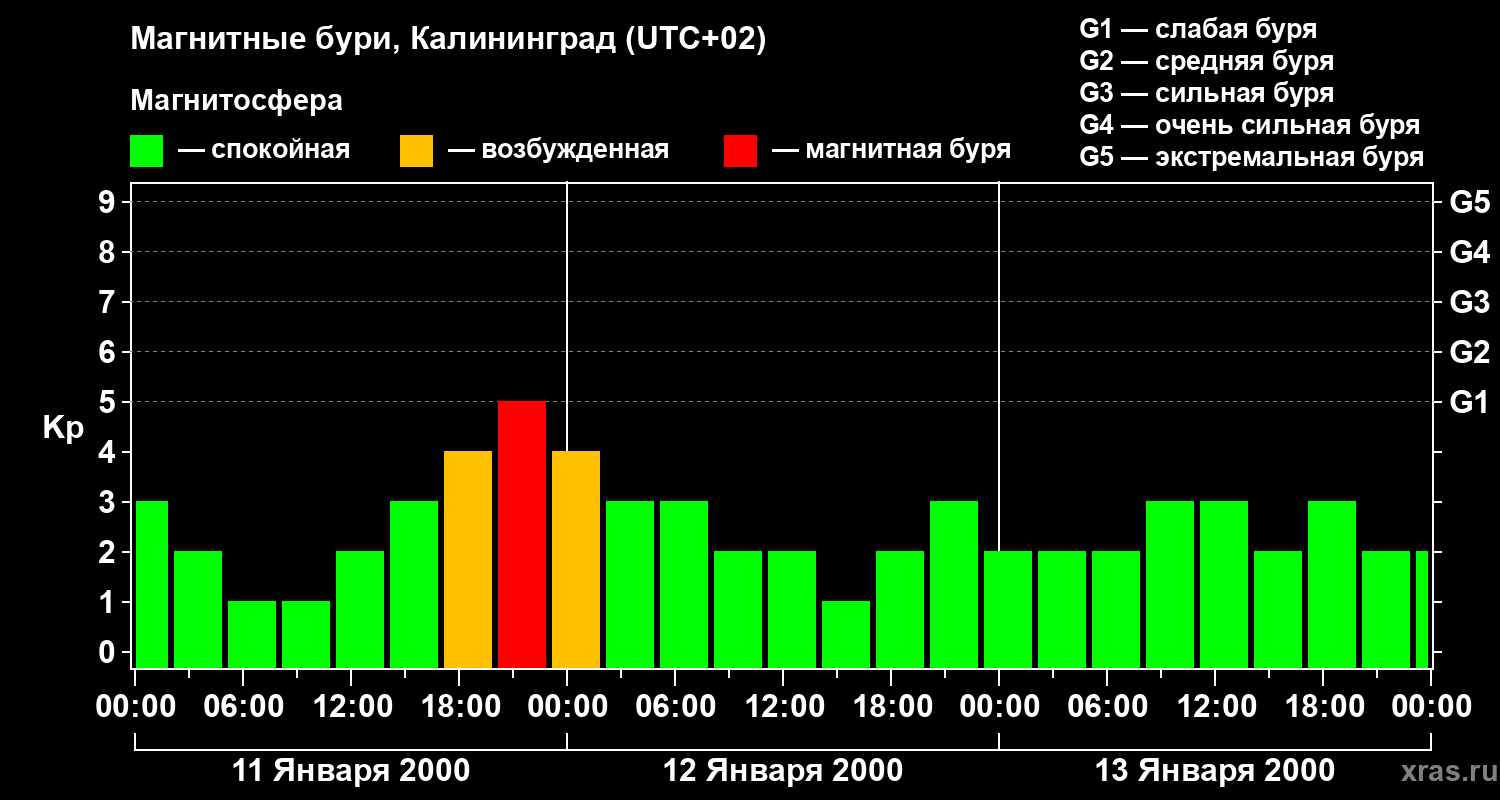 Изменения геомагнитного индекса Kp с 11 по 13 января 2000 года для средних широт
