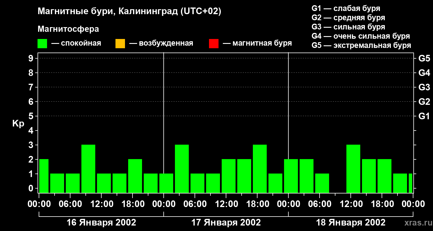 Изменения геомагнитного индекса Kp с 16 по 18 января 2002 года для средних широт