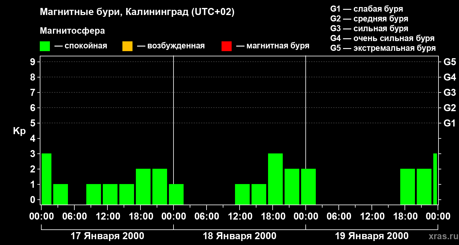 Изменения геомагнитного индекса Kp с 17 по 19 января 2000 года для средних широт