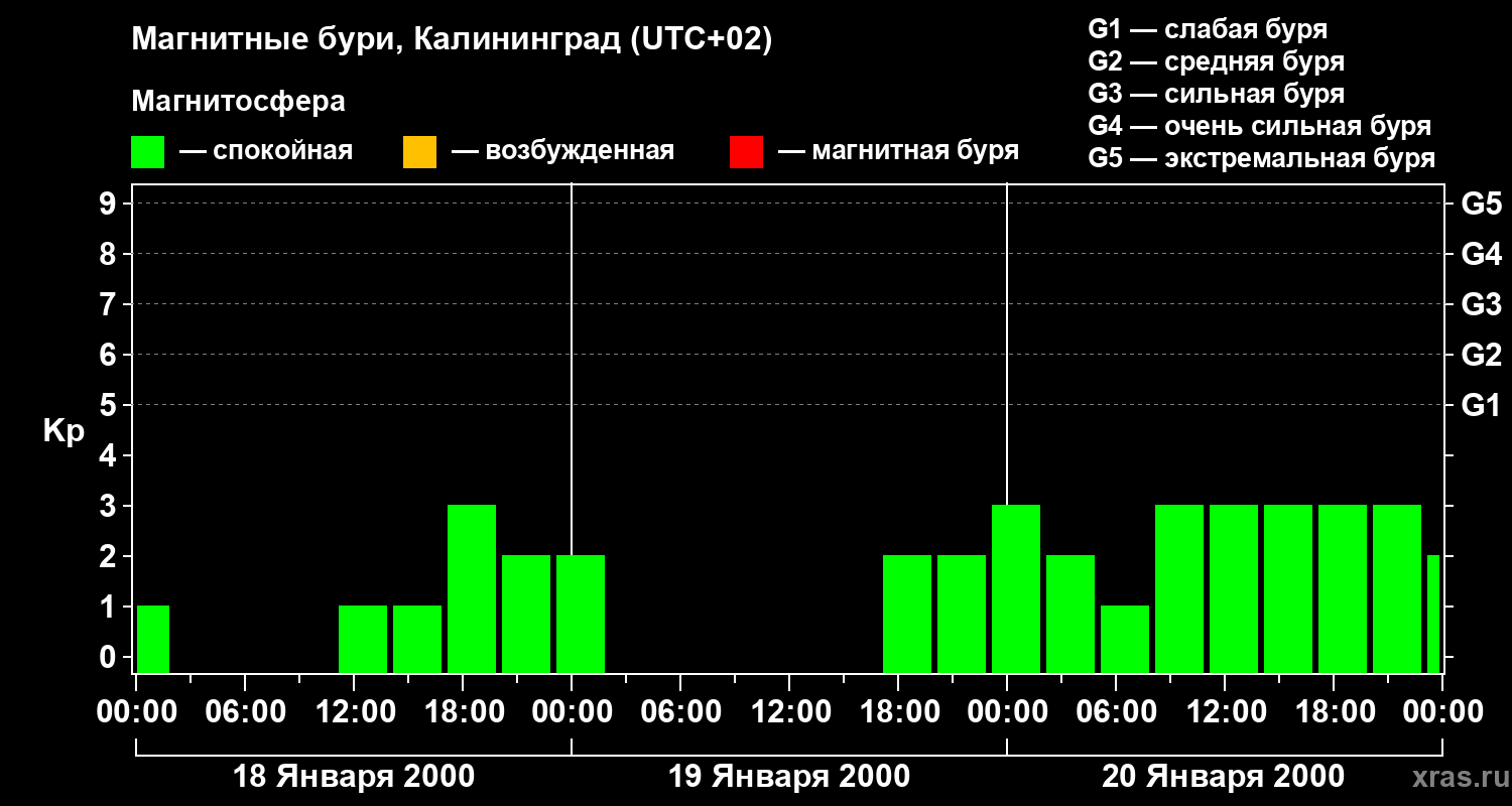 Изменения геомагнитного индекса Kp с 18 по 20 января 2000 года для средних широт