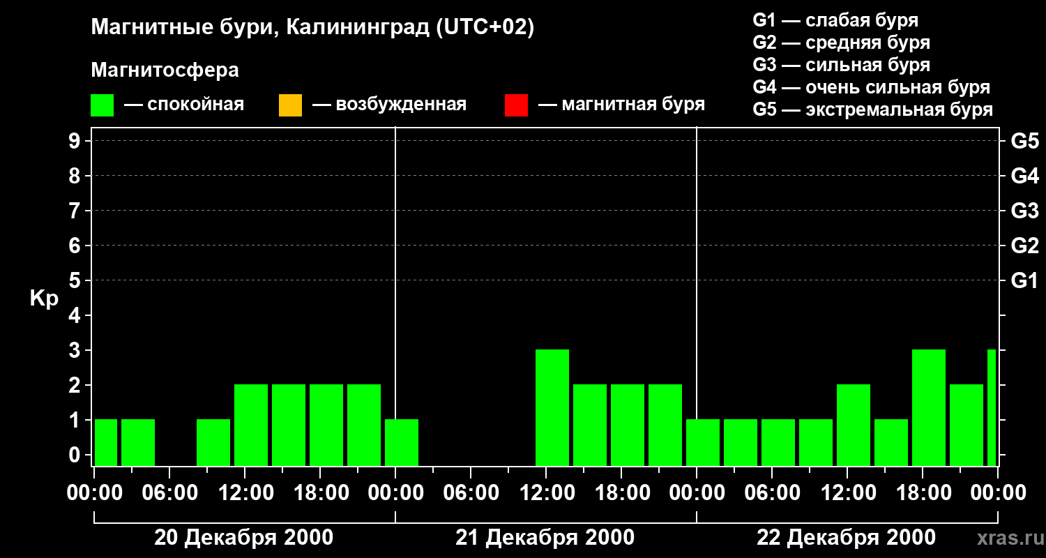 Изменения геомагнитного индекса Kp с 20 по 22 декабря 2000 года для средних широт