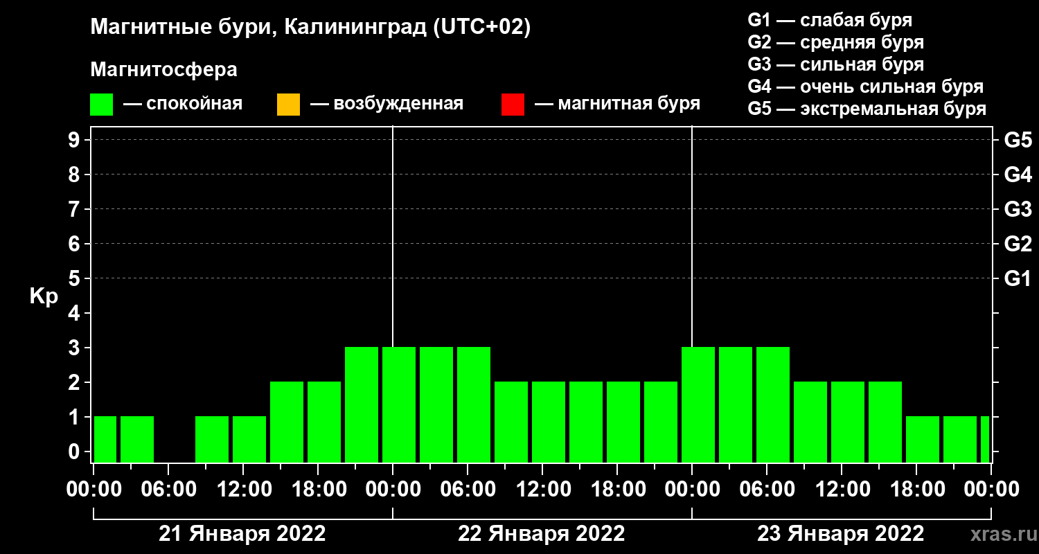 Изменения геомагнитного индекса Kp с 21 по 23 января 2022 года для средних широт