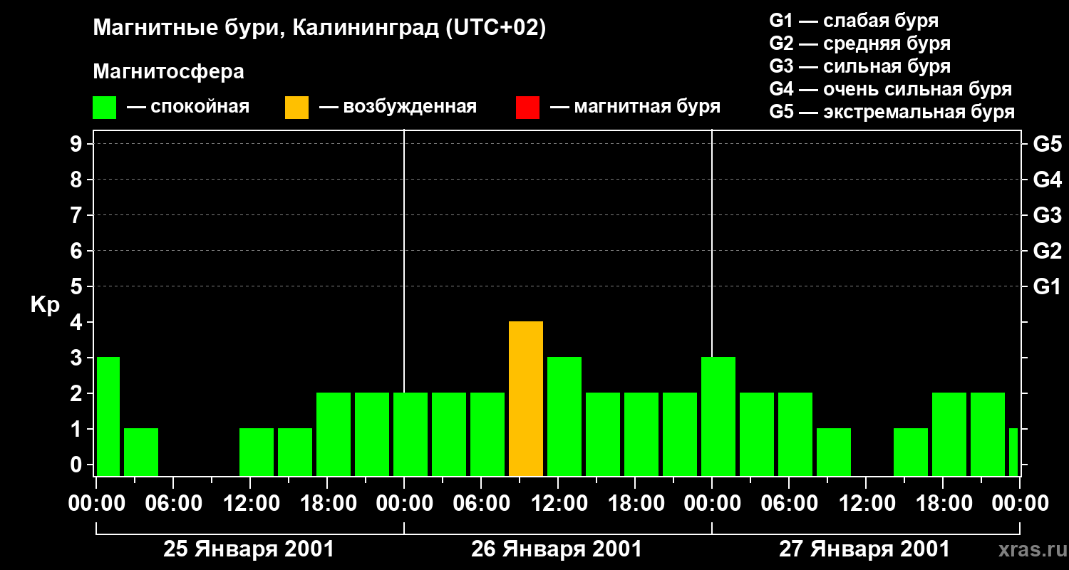 Изменения геомагнитного индекса Kp с 25 по 27 января 2001 года для средних широт