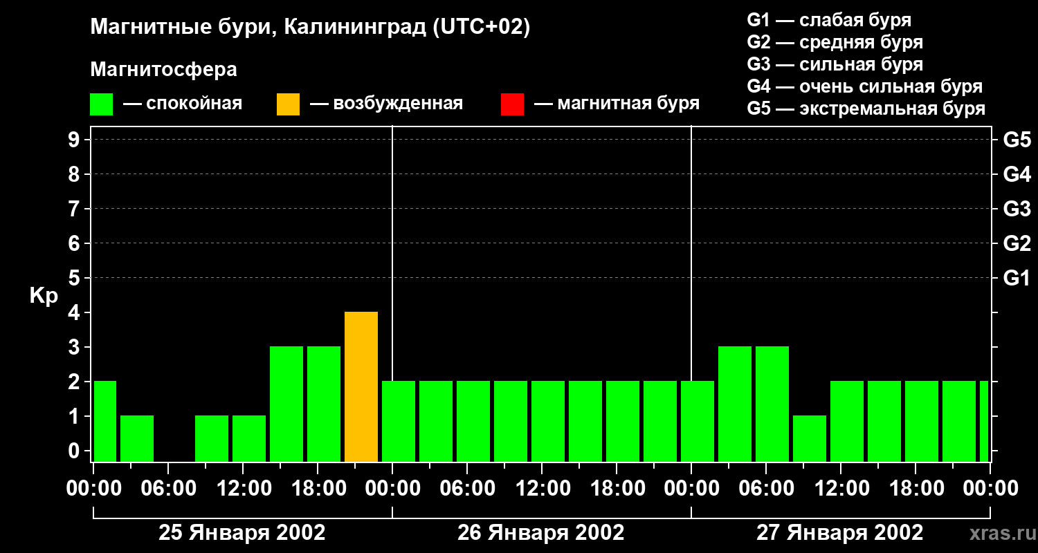 Изменения геомагнитного индекса Kp с 25 по 27 января 2002 года для средних широт