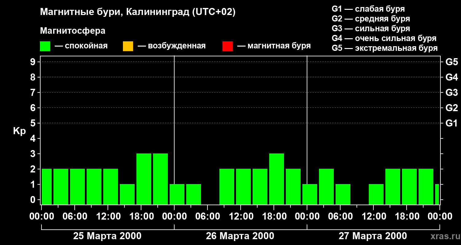 Изменения геомагнитного индекса Kp с 25 по 27 марта 2000 года для средних широт