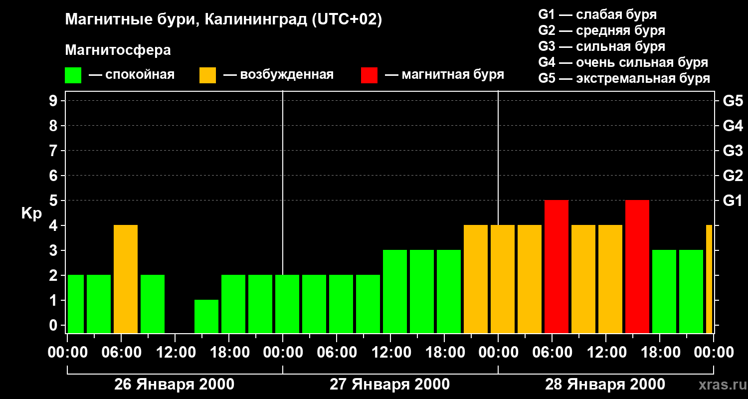 Изменения геомагнитного индекса Kp с 26 по 28 января 2000 года для средних широт