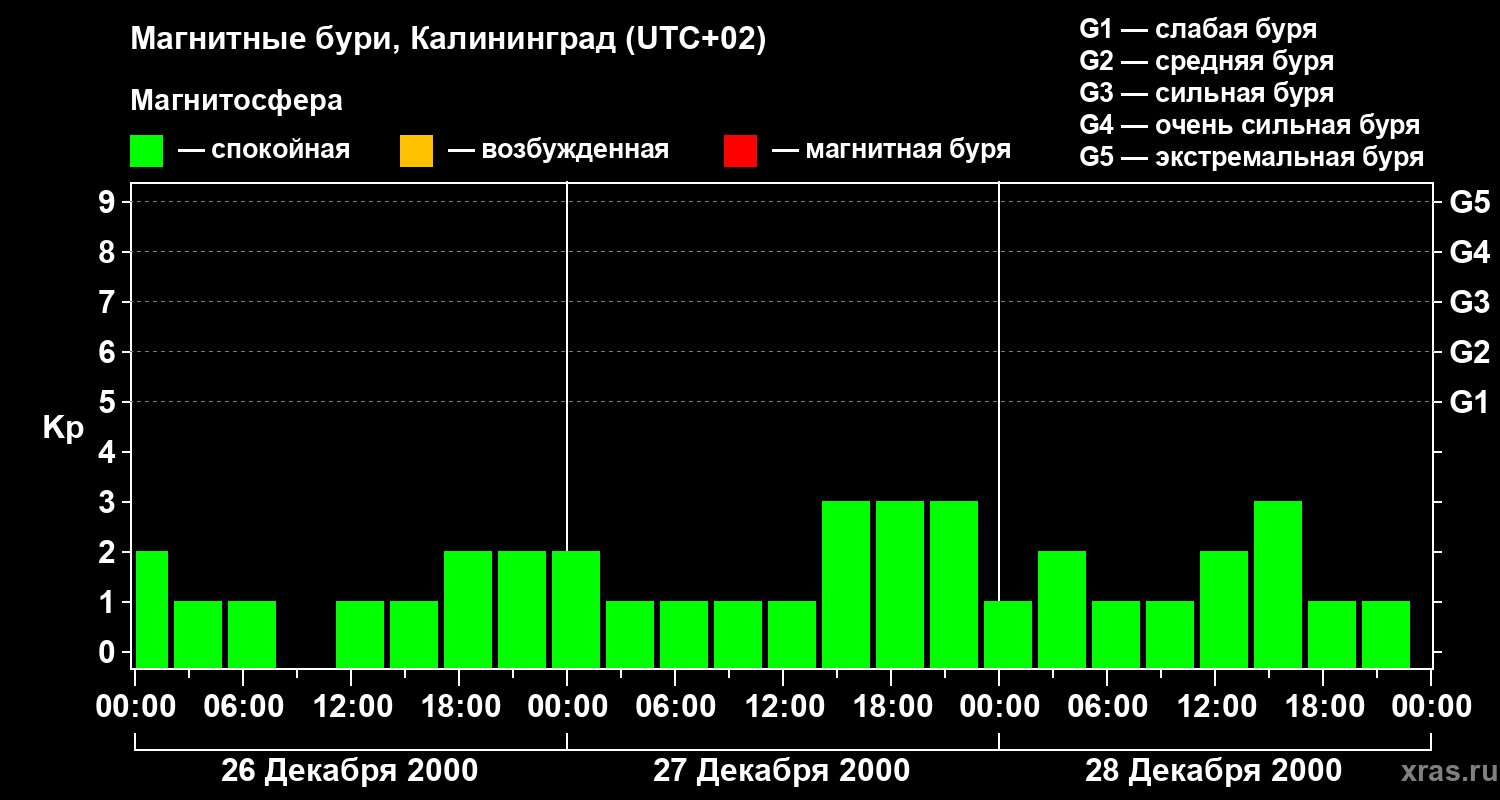 Изменения геомагнитного индекса Kp с 26 по 28 декабря 2000 года для средних широт