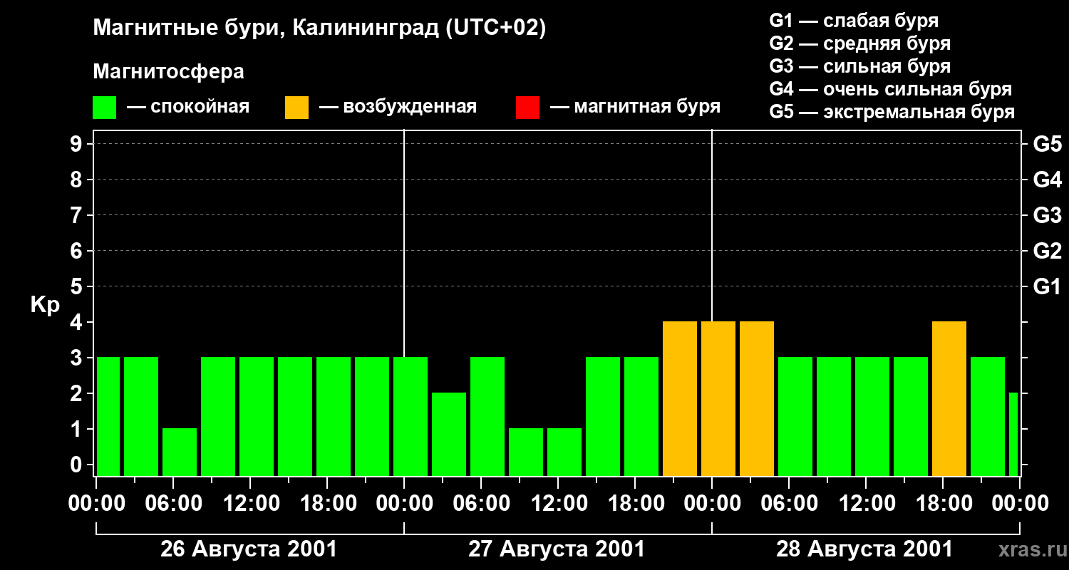 Изменения геомагнитного индекса Kp с 26 по 28 августа 2001 года для средних широт