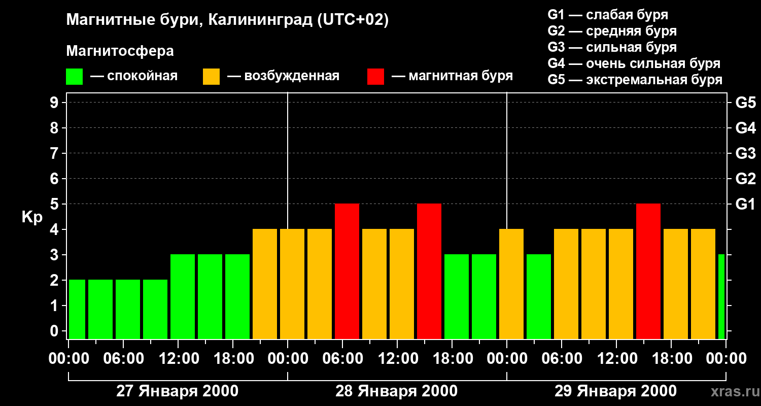 Изменения геомагнитного индекса Kp с 27 по 29 января 2000 года для средних широт