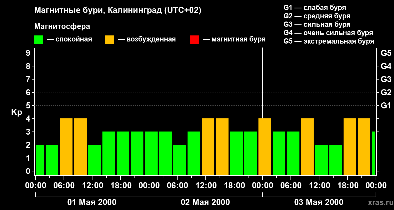 Изменения геомагнитного индекса Kp с 1 по 3 мая 2000 года для средних широт