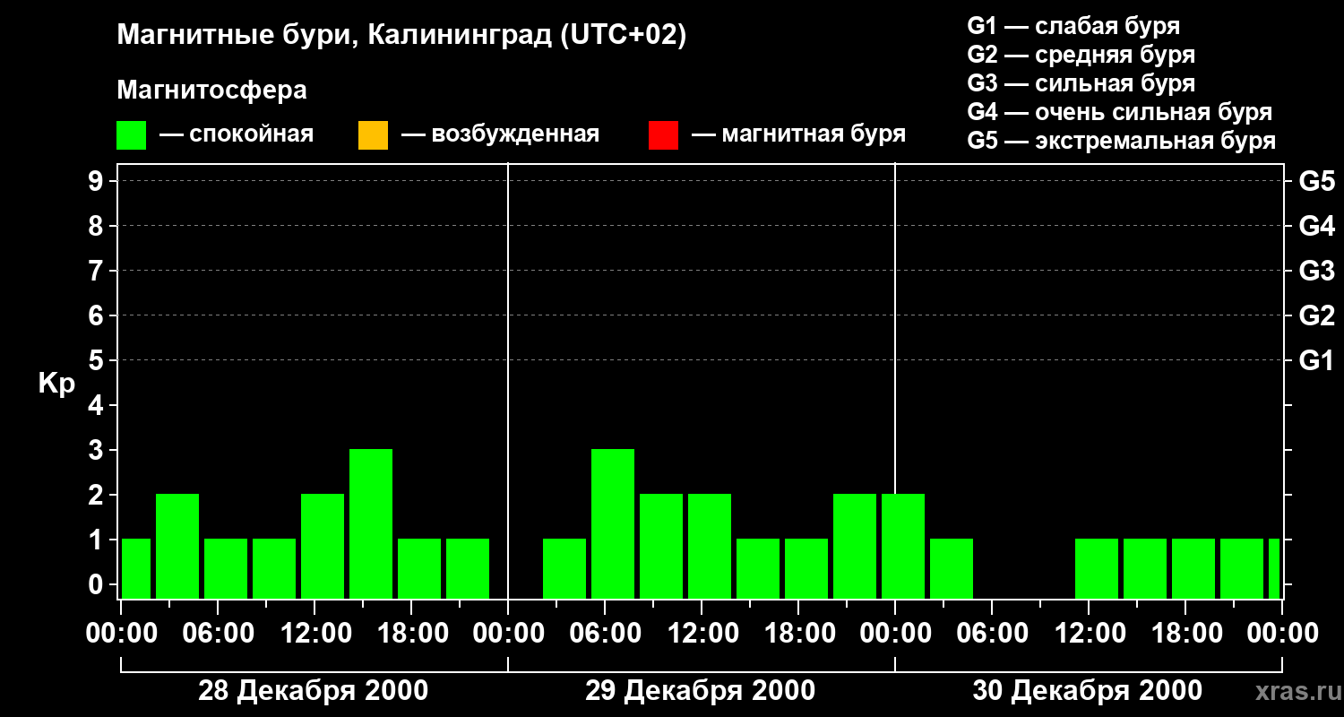 Изменения геомагнитного индекса Kp с 28 по 30 декабря 2000 года для средних широт