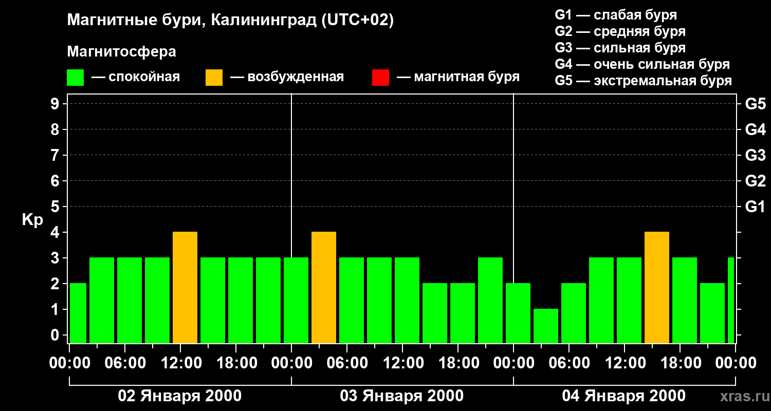 Изменения геомагнитного индекса Kp с 2 по 4 января 2000 года для средних широт