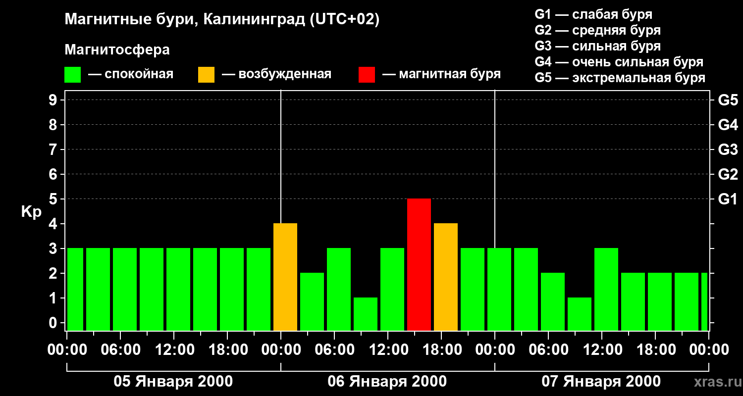 Изменения геомагнитного индекса Kp с 5 по 7 января 2000 года для средних широт