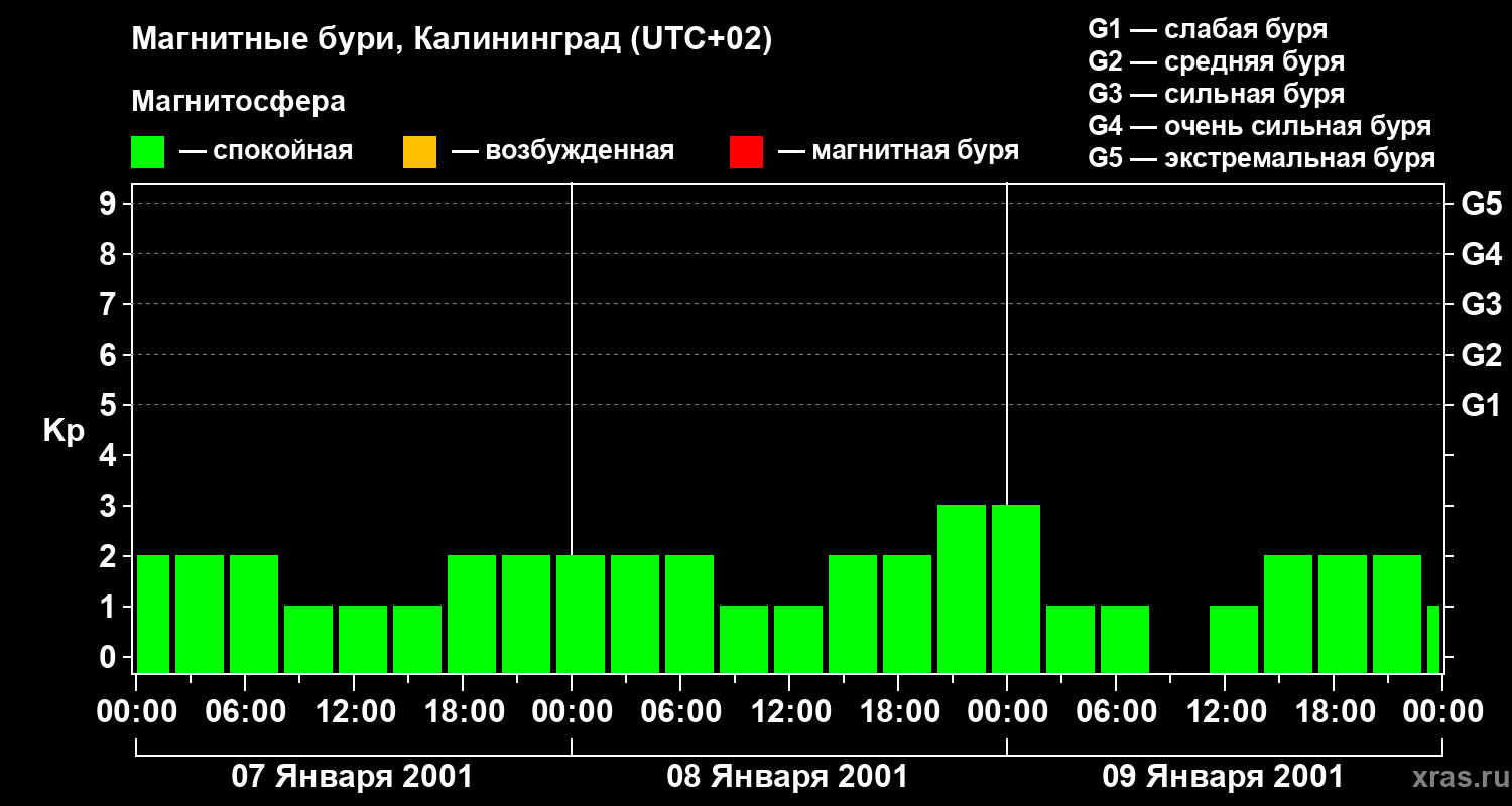 Изменения геомагнитного индекса Kp с 7 по 9 января 2001 года для средних широт
