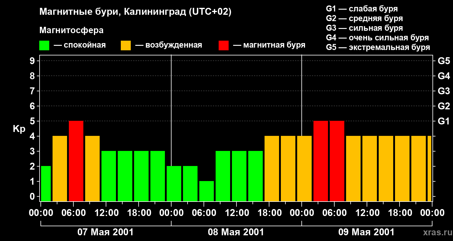 Изменения геомагнитного индекса Kp с 7 по 9 мая 2001 года для средних широт