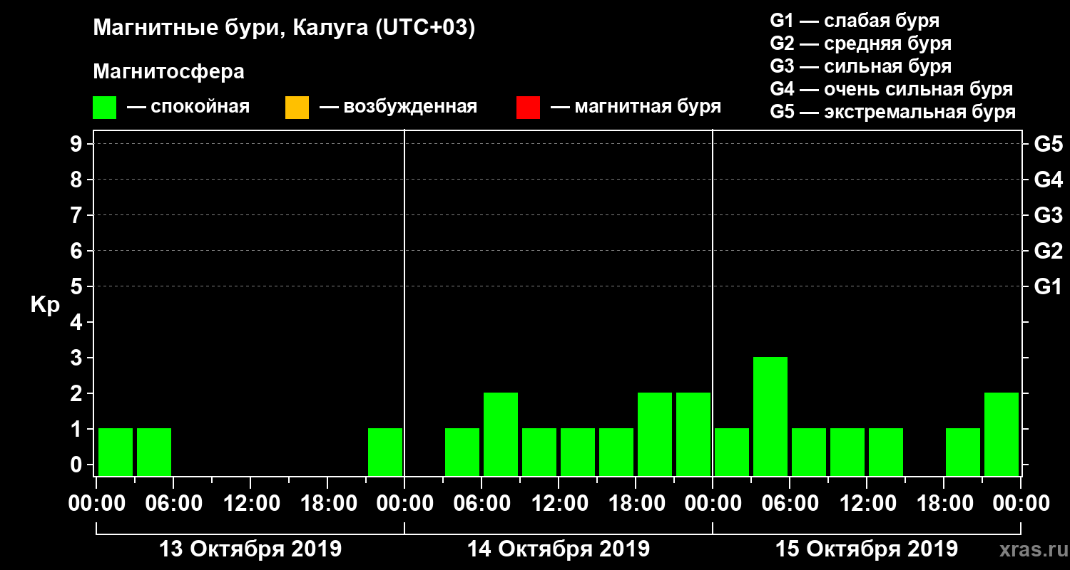 Изменения геомагнитного индекса Kp с 13 по 15 октября 2019 года для средних широт