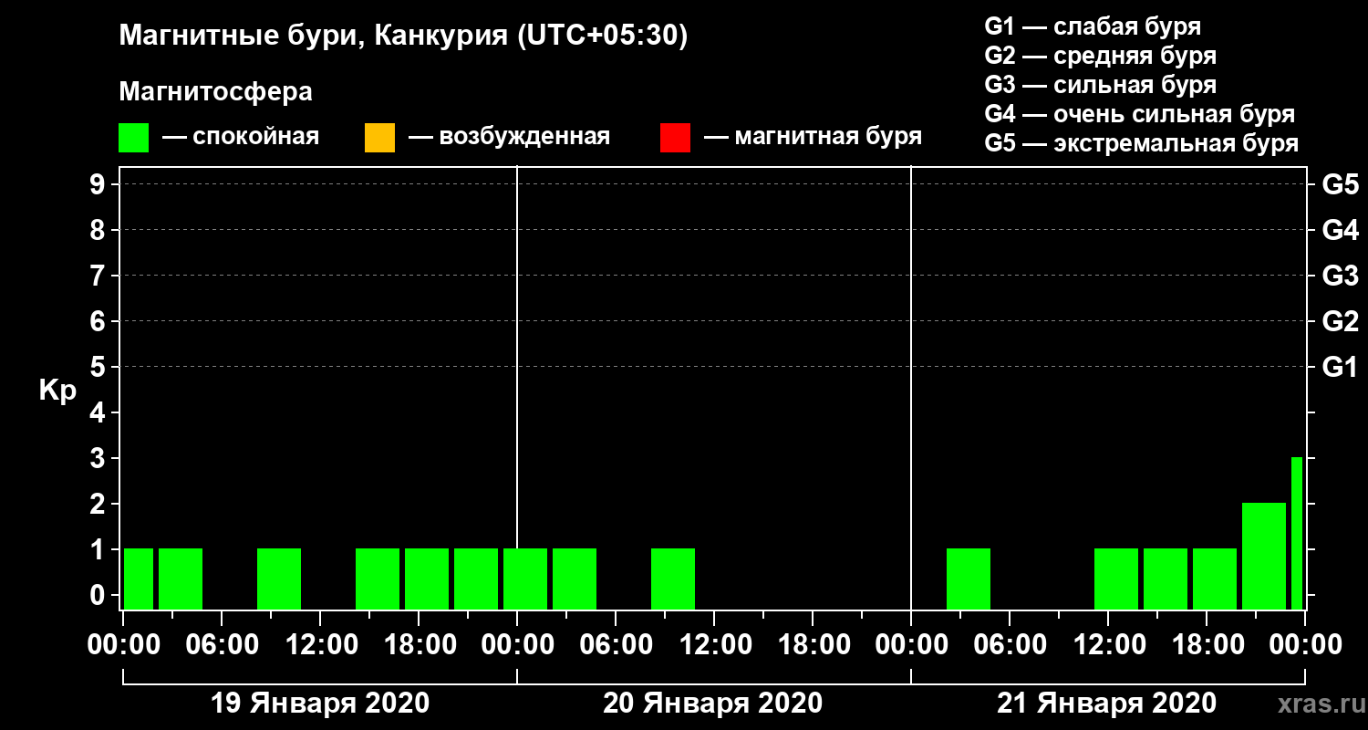 Изменения геомагнитного индекса Kp с 19 по 21 января 2020 года для средних широт