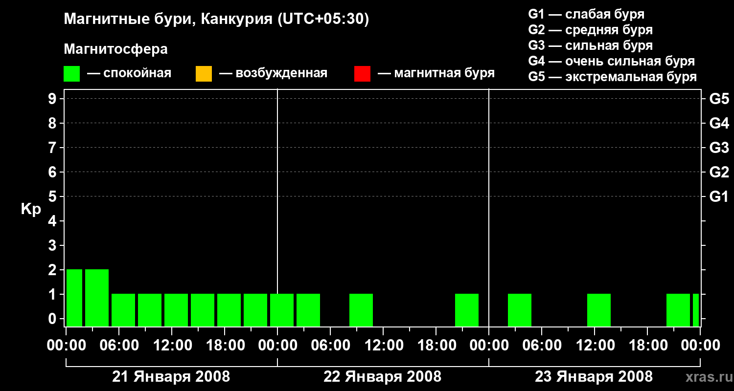 Изменения геомагнитного индекса Kp с 21 по 23 января 2008 года для средних широт