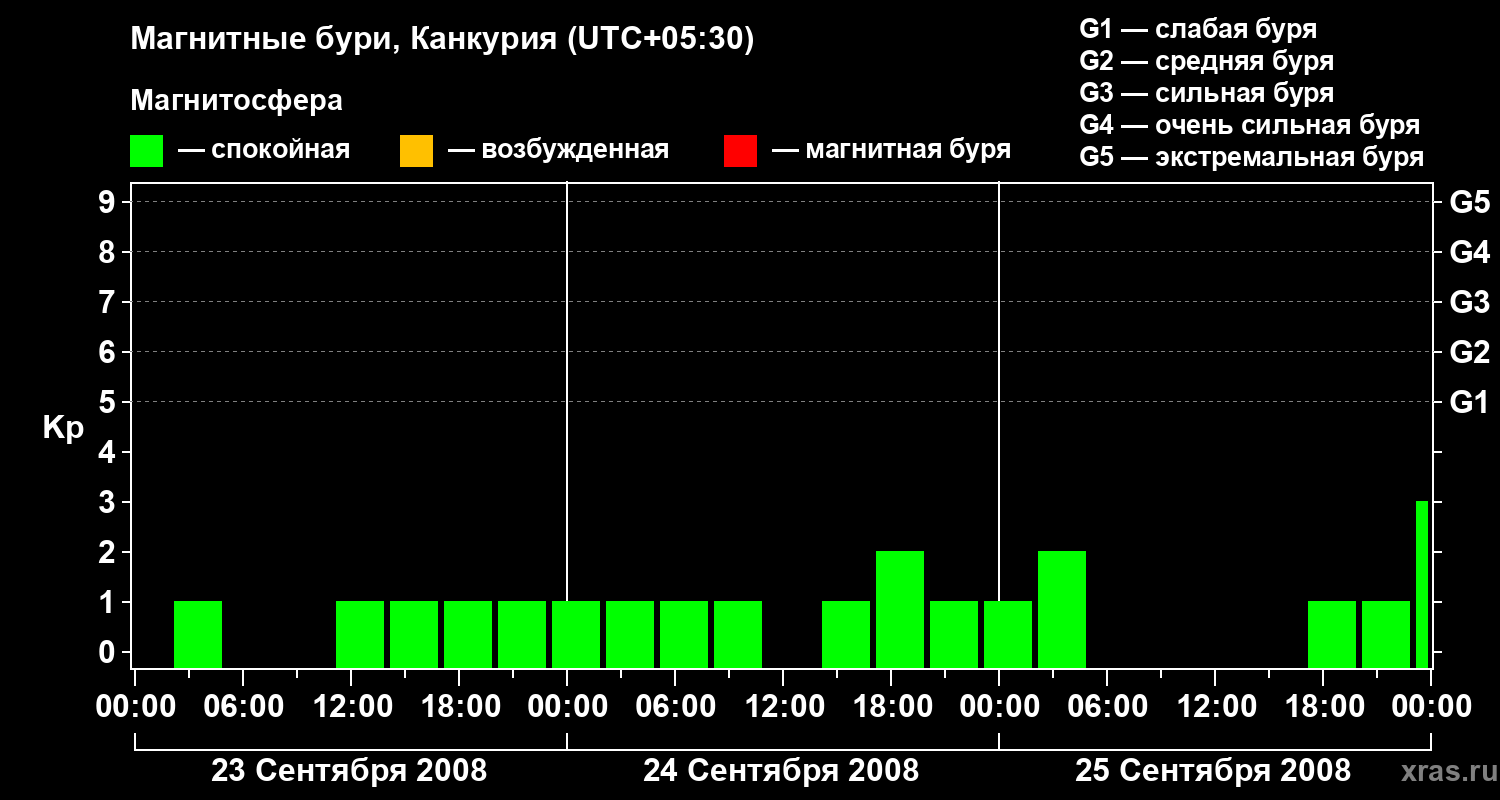 Изменения геомагнитного индекса Kp с 23 по 25 сентября 2008 года для средних широт