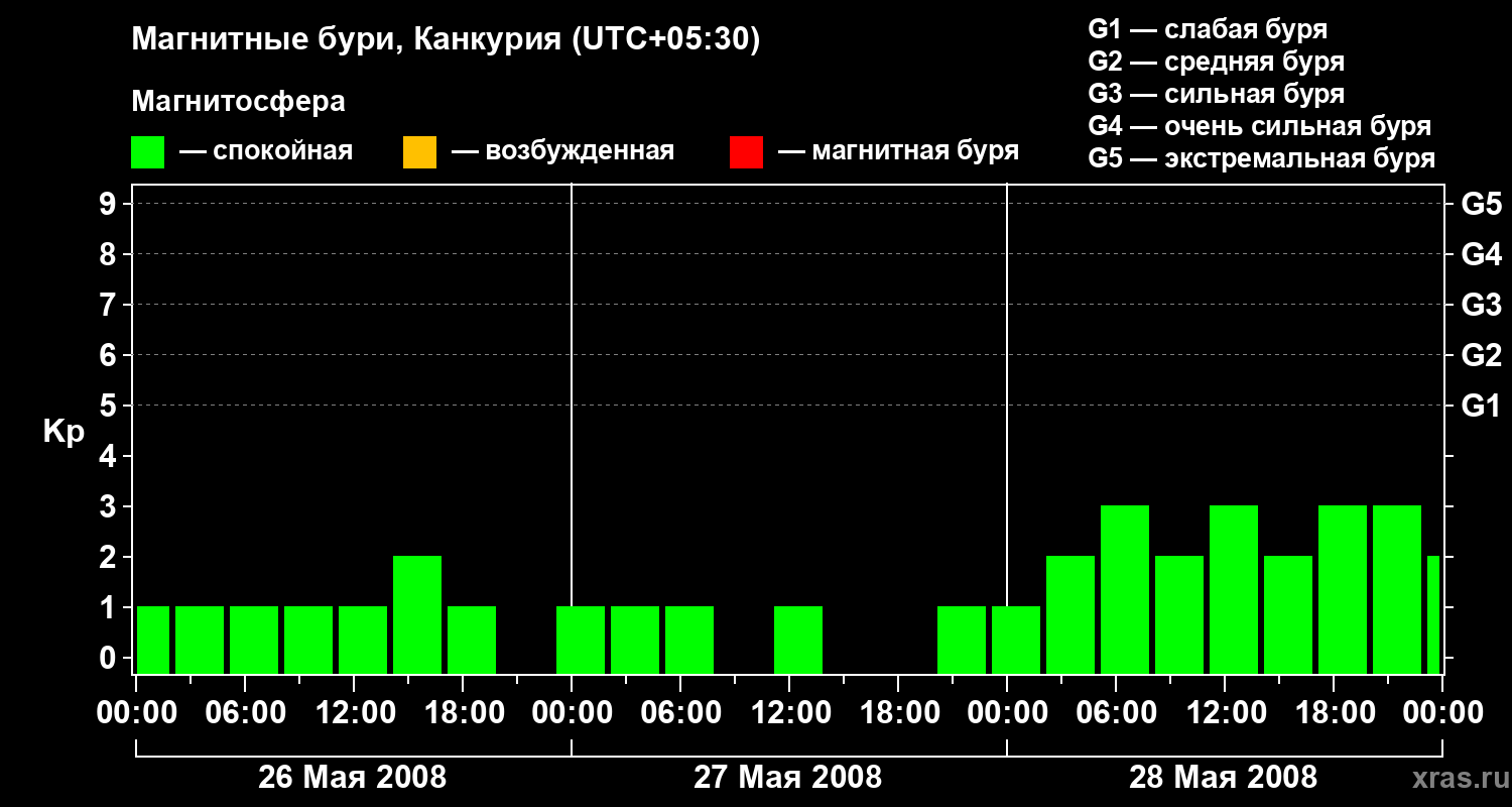 Изменения геомагнитного индекса Kp с 26 по 28 мая 2008 года для средних широт