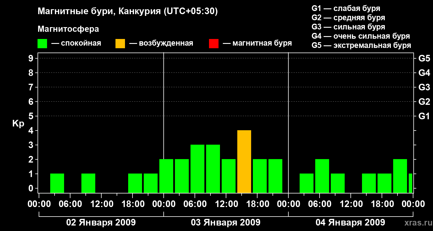 Изменения геомагнитного индекса Kp с 2 по 4 января 2009 года для средних широт