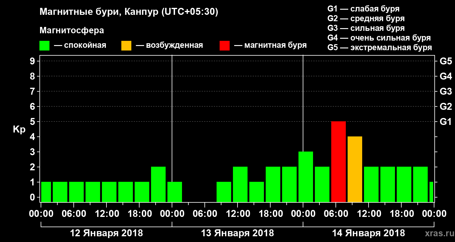Изменения геомагнитного индекса Kp с 12 по 14 января 2018 года для средних широт