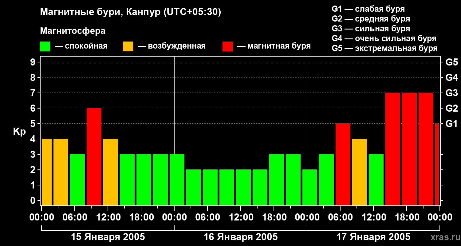Изменения геомагнитного индекса Kp с 15 по 17 января 2005 года для средних широт