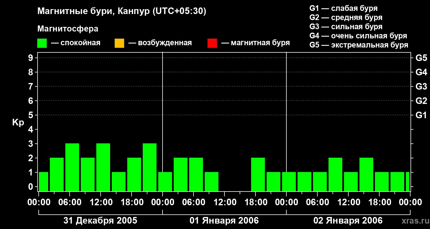 Изменения геомагнитного индекса Kp с 31 декабря 2005 года по 2 января 2006 года для средних широт