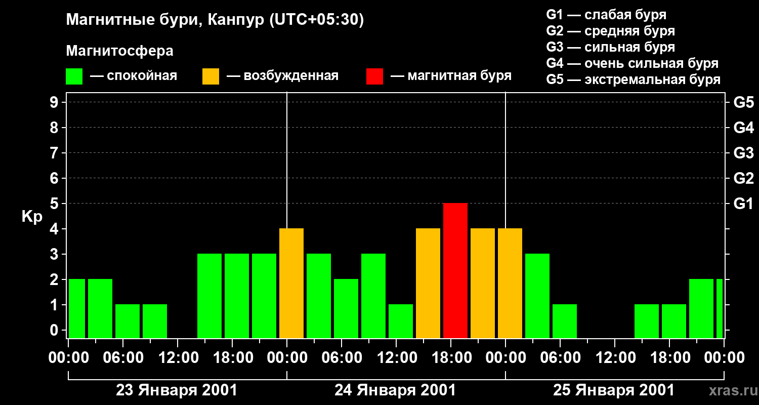 Изменения геомагнитного индекса Kp с 23 по 25 января 2001 года для средних широт