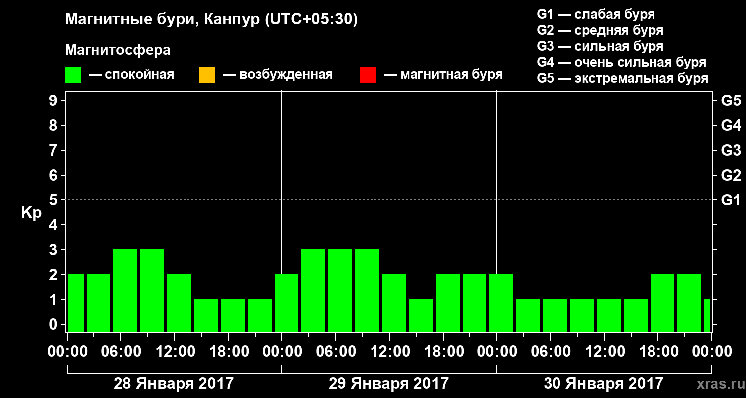 Изменения геомагнитного индекса Kp с 28 по 30 января 2017 года для средних широт