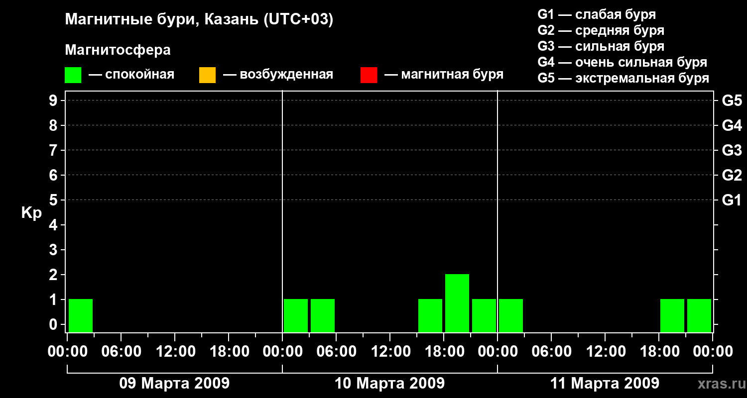 Изменения геомагнитного индекса Kp с 9 по 11 марта 2009 года для средних широт