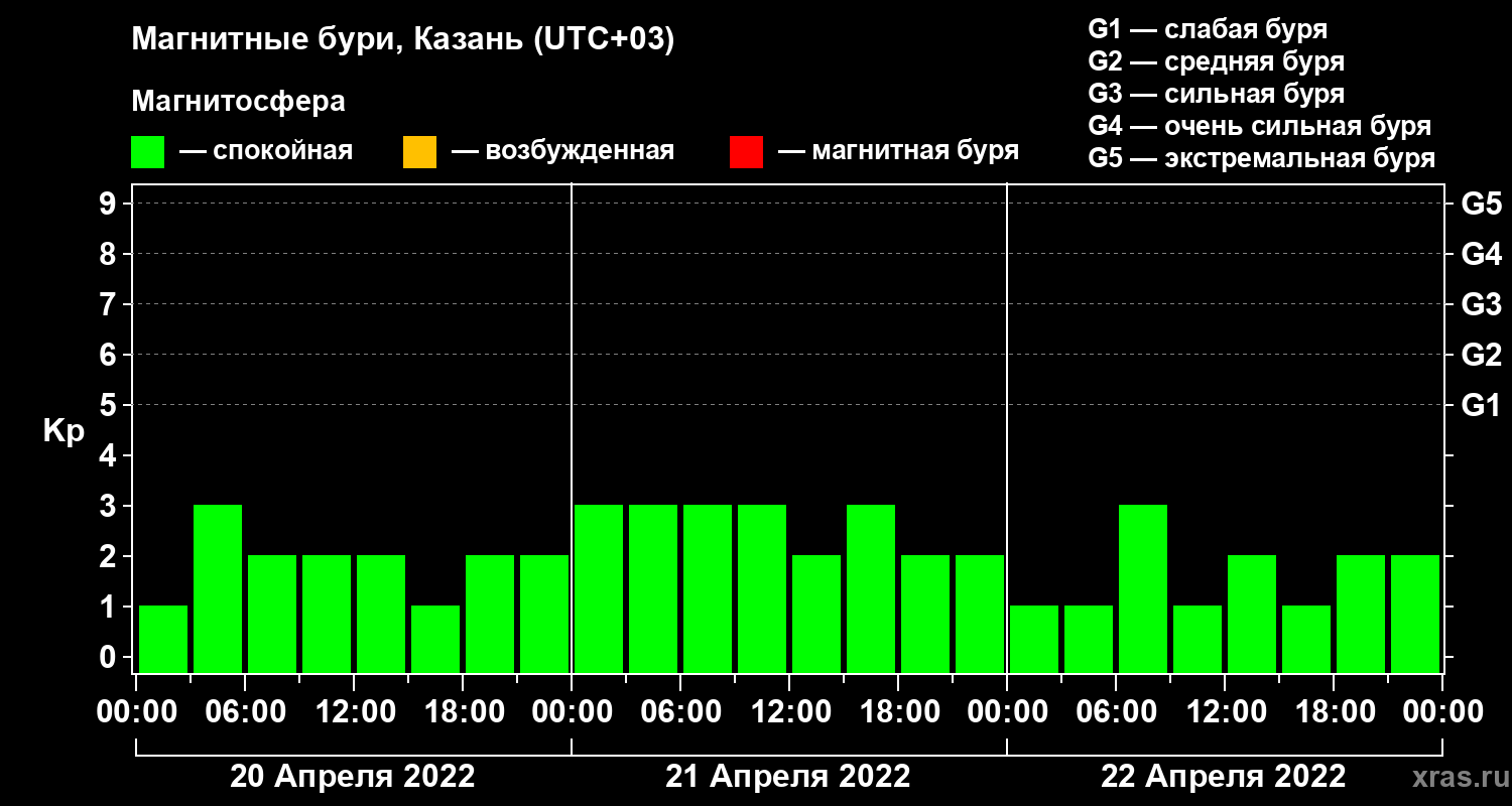 Изменения геомагнитного индекса Kp с 20 по 22 апреля 2022 года для средних широт