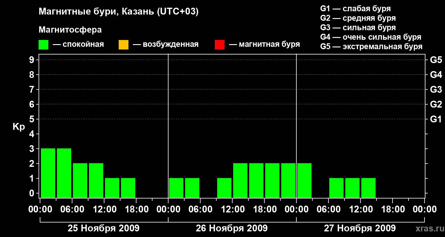 Изменения геомагнитного индекса Kp с 25 по 27 ноября 2009 года для средних широт