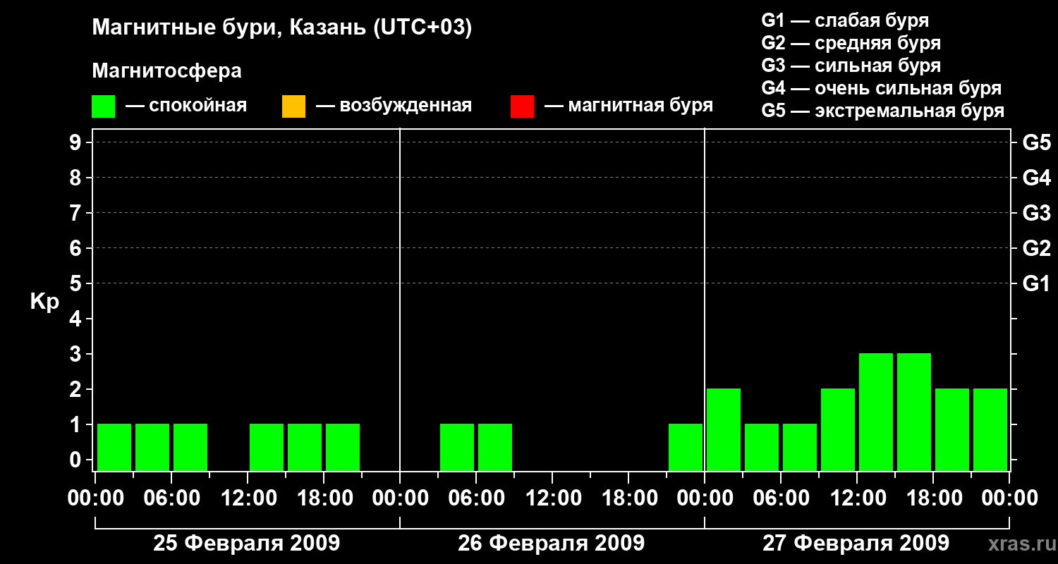 Изменения геомагнитного индекса Kp с 25 по 27 февраля 2009 года для средних широт
