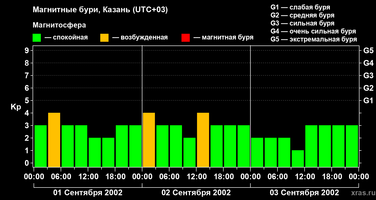 Изменения геомагнитного индекса Kp с 1 по 3 сентября 2002 года для средних широт