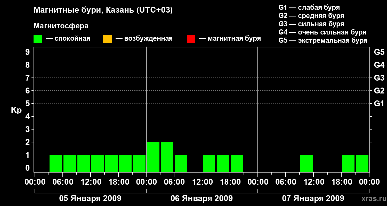 Изменения геомагнитного индекса Kp с 5 по 7 января 2009 года для средних широт
