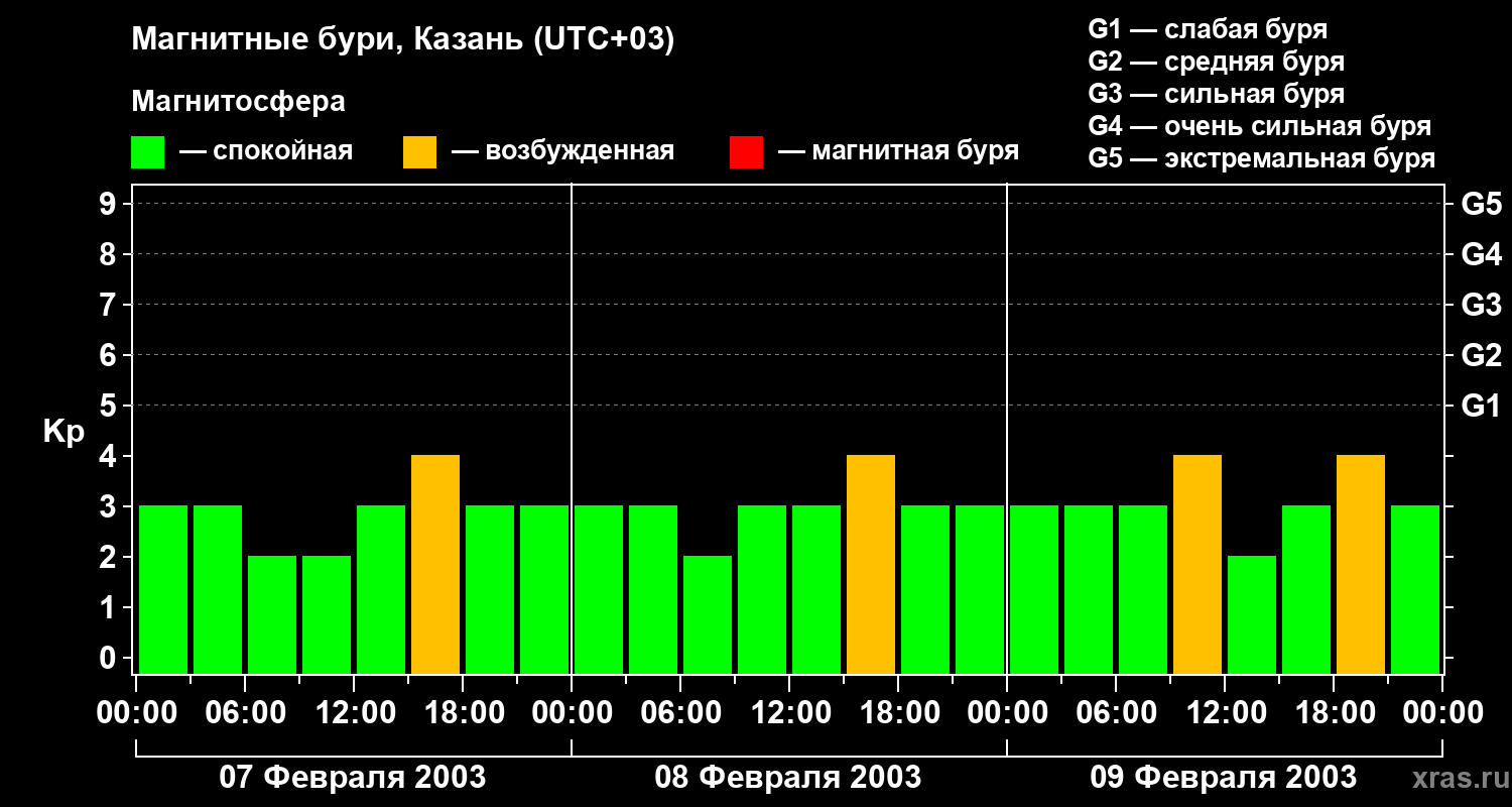 Изменения геомагнитного индекса Kp с 7 по 9 февраля 2003 года для средних широт