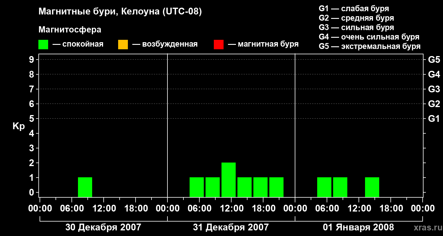 Изменения геомагнитного индекса Kp с 30 декабря 2007 года по 1 января 2008 года для средних широт