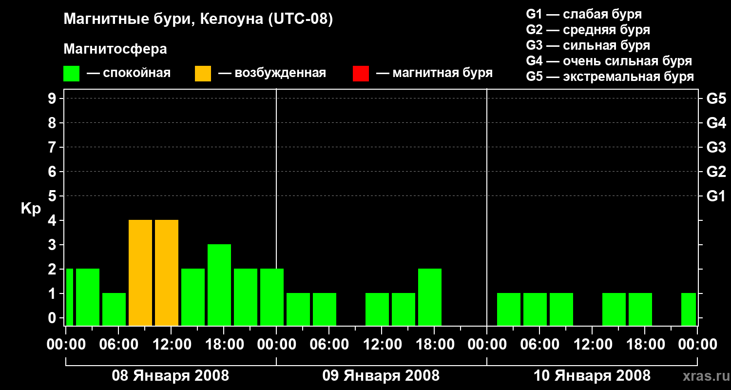 Изменения геомагнитного индекса Kp с 8 по 10 января 2008 года для средних широт